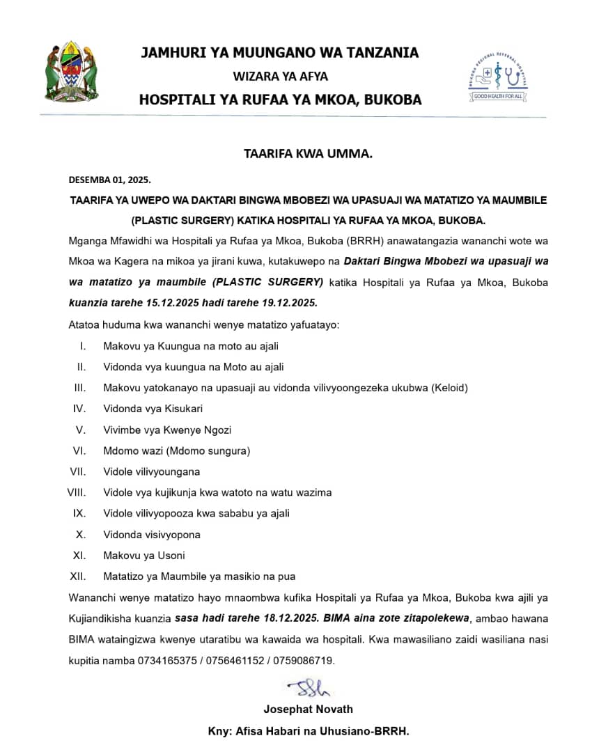 TAARIFA KWA UMMA : UWEPO WA DAKTARI BINGWA WA UPASUAJI WA MATATIOZO YA MAUMBILE (PLASTIC SURGERY) KATIKA HOSPITALI YA RUFAA YA MKOA, BUKOBA